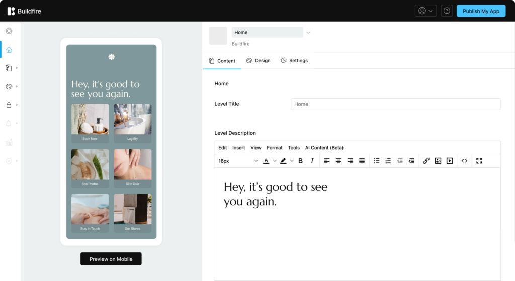 You can use an app building service and use some coding. I’m referring to the Buildfire software development kit. Instead of having our team build the app for you, this kit can teach you how to build it yourself. Once you learn how to add custom features for your clients, you’ll be able to generate more profit.