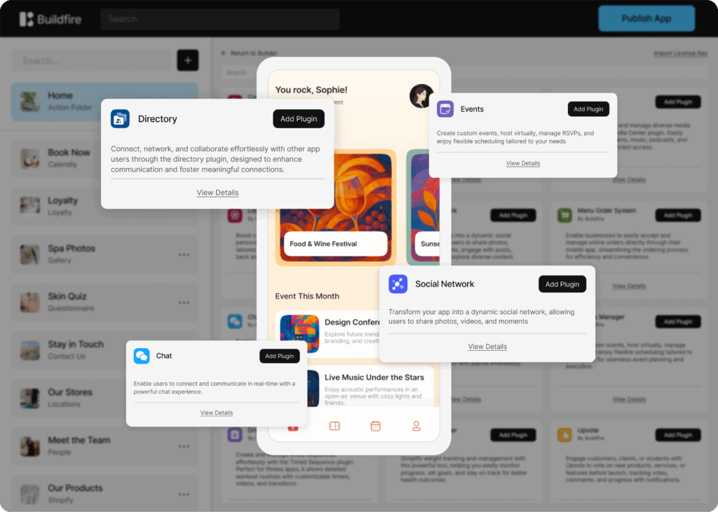 White-glove platform route: Select from pre-built, proven plugins like quizzes, questionnaires, community features, content management, and more. These aren’t experimental; they’re battle-tested features that thousands of apps use successfully. You can build the app yourself using the control panel, or work with Buildfire’s agency team that includes a dedicated project manager, developers, and designers who coordinate the build at a much more affordable price than custom development.